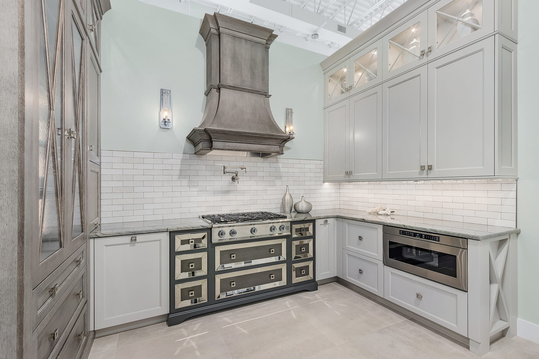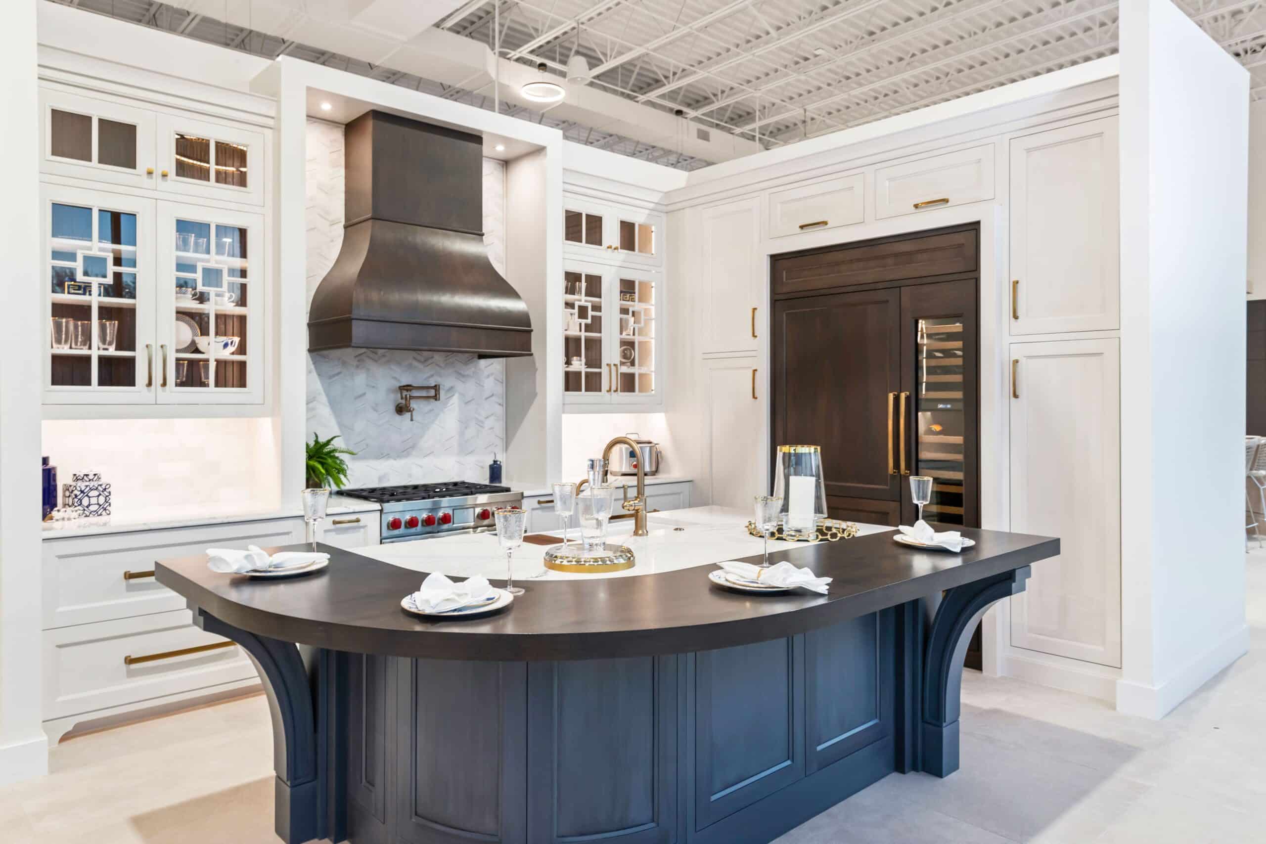 The Lux Kitchen showroom is designed to feel richly detailed, timeless, and unmistakably upscale. Inset cabinetry, walnut accents, luxe metal finishes, and professional-grade appliances come together to create a kitchen that feels elegant and fully equipped for real culinary living.
