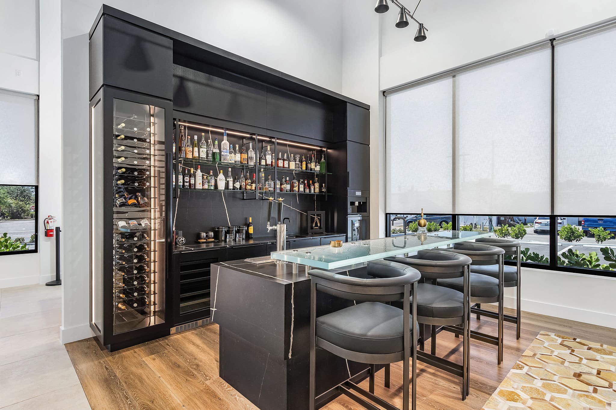 The Bar Lounge was conceived as a statement entertaining zone: tailored, moody, and highly functional. Specialty appliances, sparkling water, beverage refrigeration, and dramatic black finishes make it feel more like a private hospitality suite than a secondary prep area.